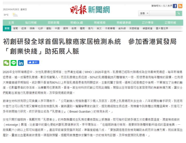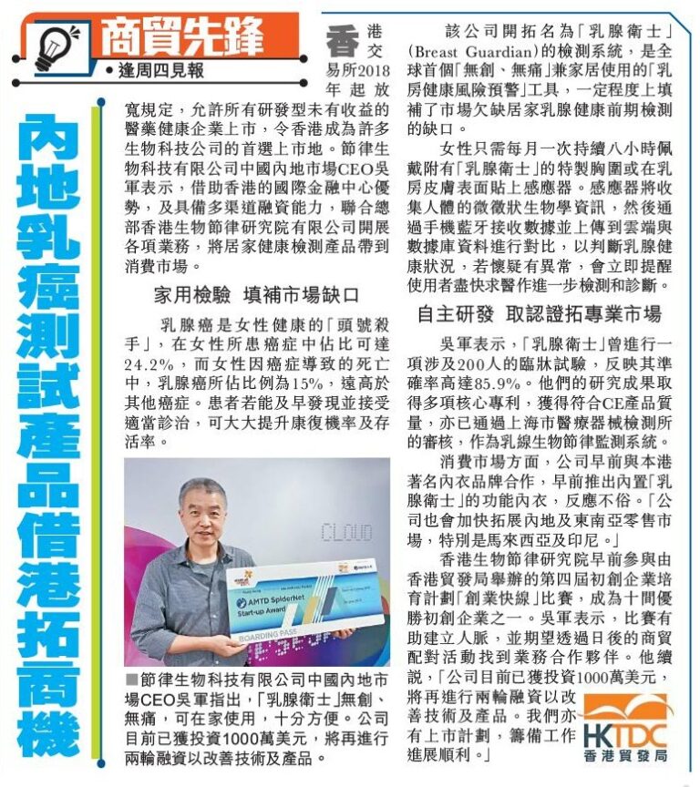筆者最近認識新創企業「香港生物節律研究院有限公司], 已研發出一款能夠撿測乳腺健康的胸圍,這個針對質密性乳腺組織的突破性篩查方法,提供了一個無創、非放射、非壓迫、及能早發現乳癌的新方案。「人體的各種生理活動,如呼吸、 消化、體溫、內分泌等呈現相應的晝夜節律性變化。」硏發團隊指出,當一個人的生活方式與內在生理時鐘節律長期不相符,患上多種疾病的風險便會增加,例如腫瘤的發生、發展都有關係。